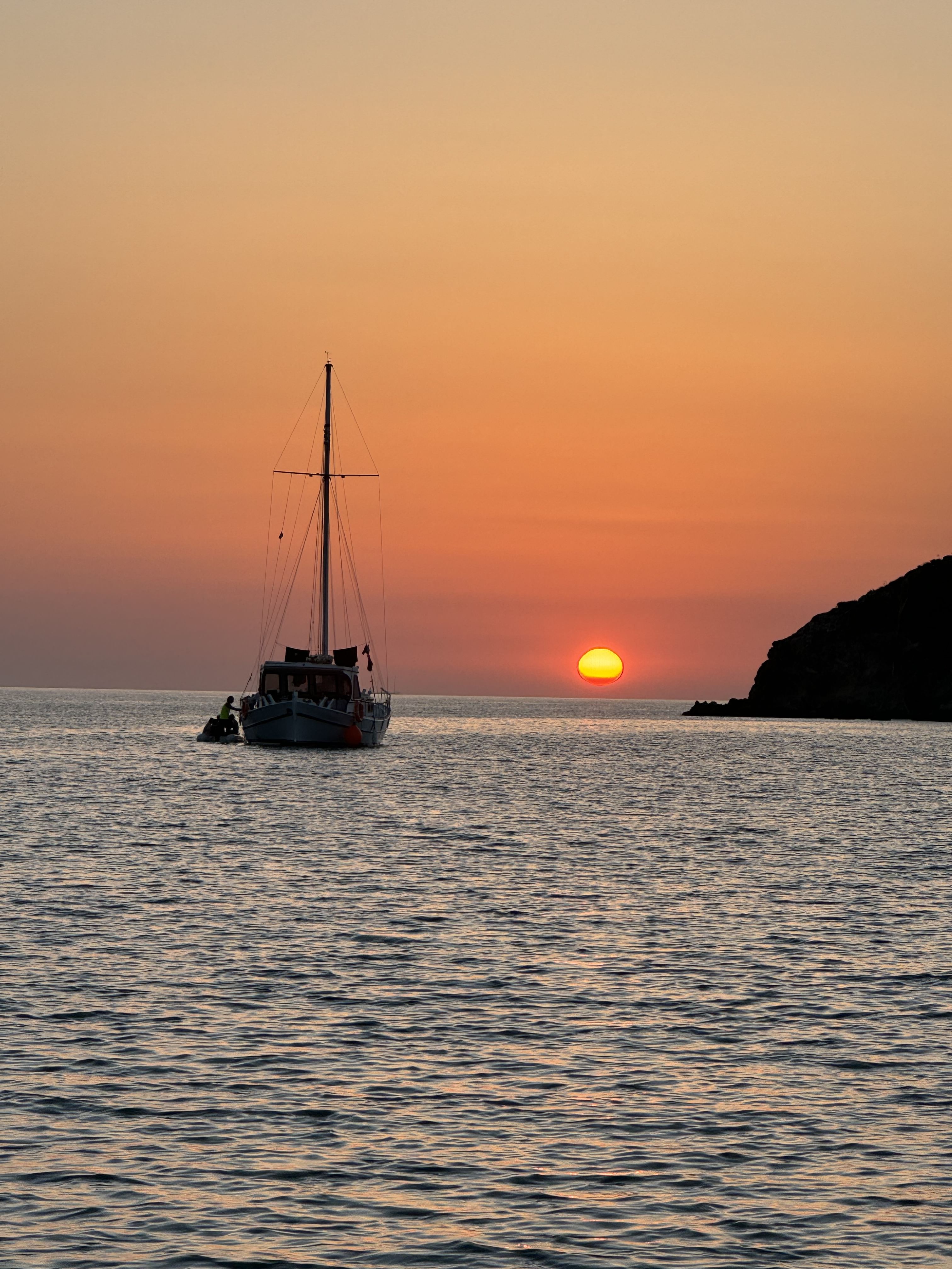 During the cruise, you'll have the opportunity to swim in crystal-clear waters at secluded spots and indulge in a delicious lunch featuring fresh, locally-sourced ingredients. The highlight of the journey comes as the sun begins to set, painting the sky with vibrant shades of orange, pink, and purple. Watching the sun dip below the horizon from the deck of Kymatia is a truly magical experience—one that captures the essence of Santorini's timeless beauty. This intimate and unforgettable sunset cruise is the perfect way to create lasting memories while enjoying the best of Santorini’s nature and heritage.